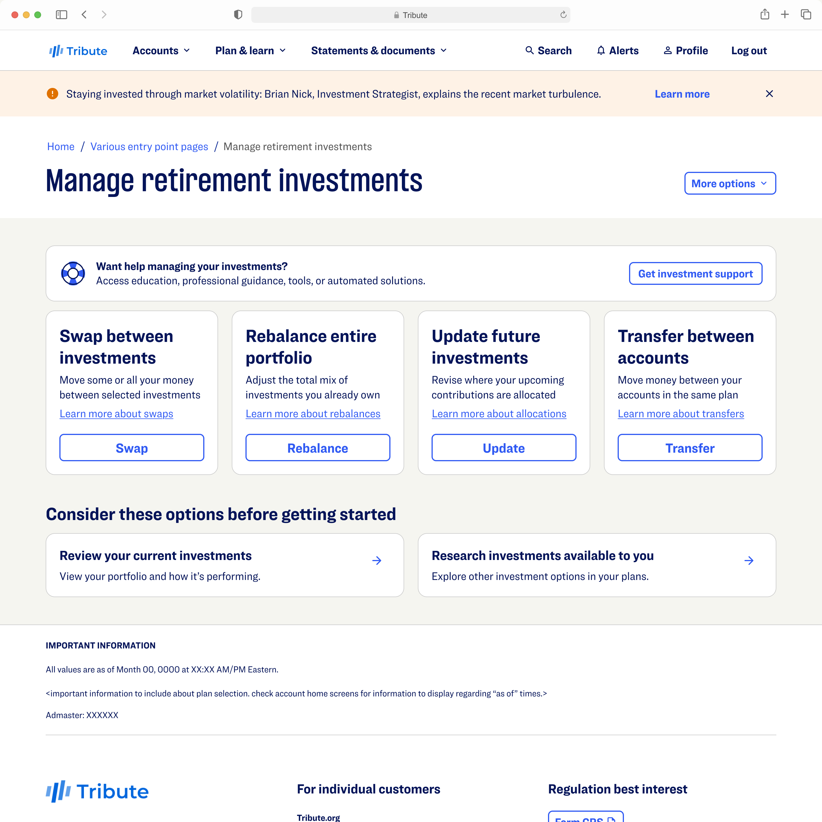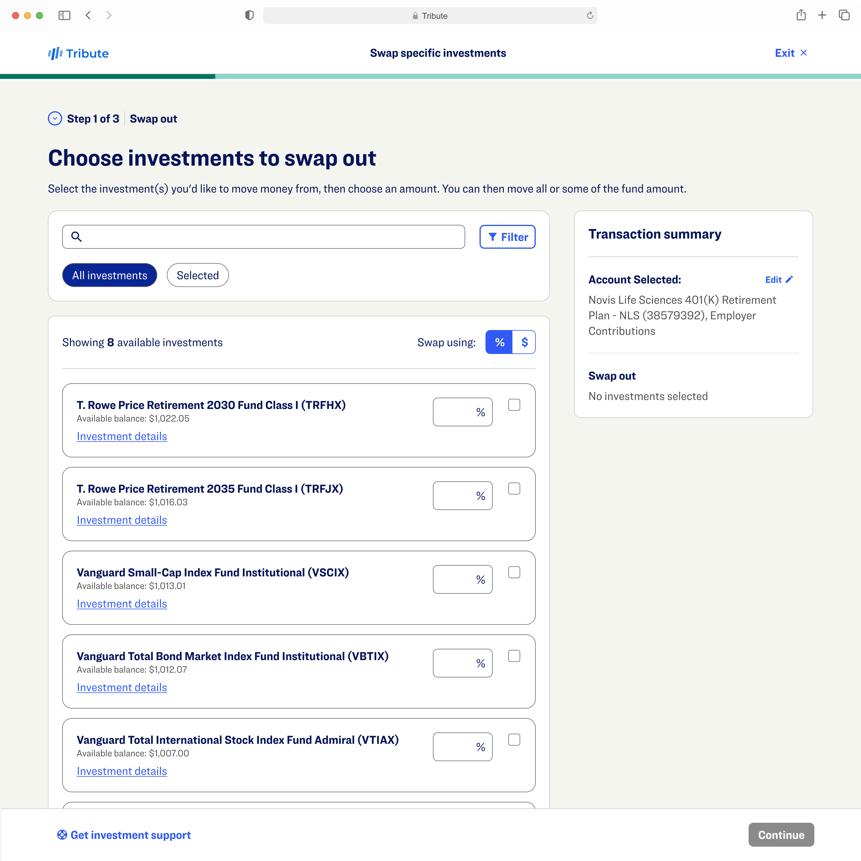 Within this effort, our team redesigned the investment exchange flow, allowing participants to move investments between funds across complex account hierarchies. The goal was to simplify a high-stakes financial task while creating reusable patterns for future transaction capabilities.